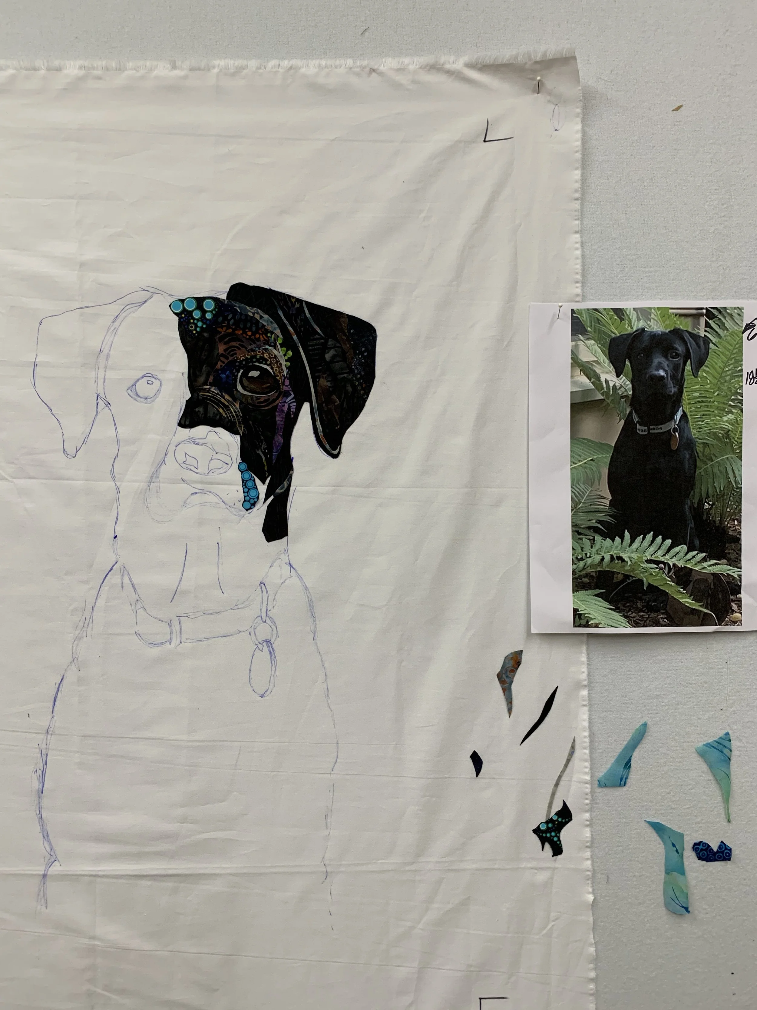 Joyce has a library of fabrics in her studio and begins pulling those fabrics off the shelves much like someone doing research in a library may pull books off of the shelves. She auditions the fabrics to see what will work and what won’t and then begins the process of preparing the fabrics for the piece of art she is creating. Each piece of fiber is cut by hand in a unique shape to convey the desired feeling of the object it is helping to create. The finished piece will go through a two-step fusion process to permanently adhere the hundreds of small pieces to become the final tapis. Each piece of art will comprise standard cottons and batiks blended with original, hand-dyed fibers that have been double-dyed for intense, vibrant colors. Each finished piece of art is a one of a kind, hand signed original.